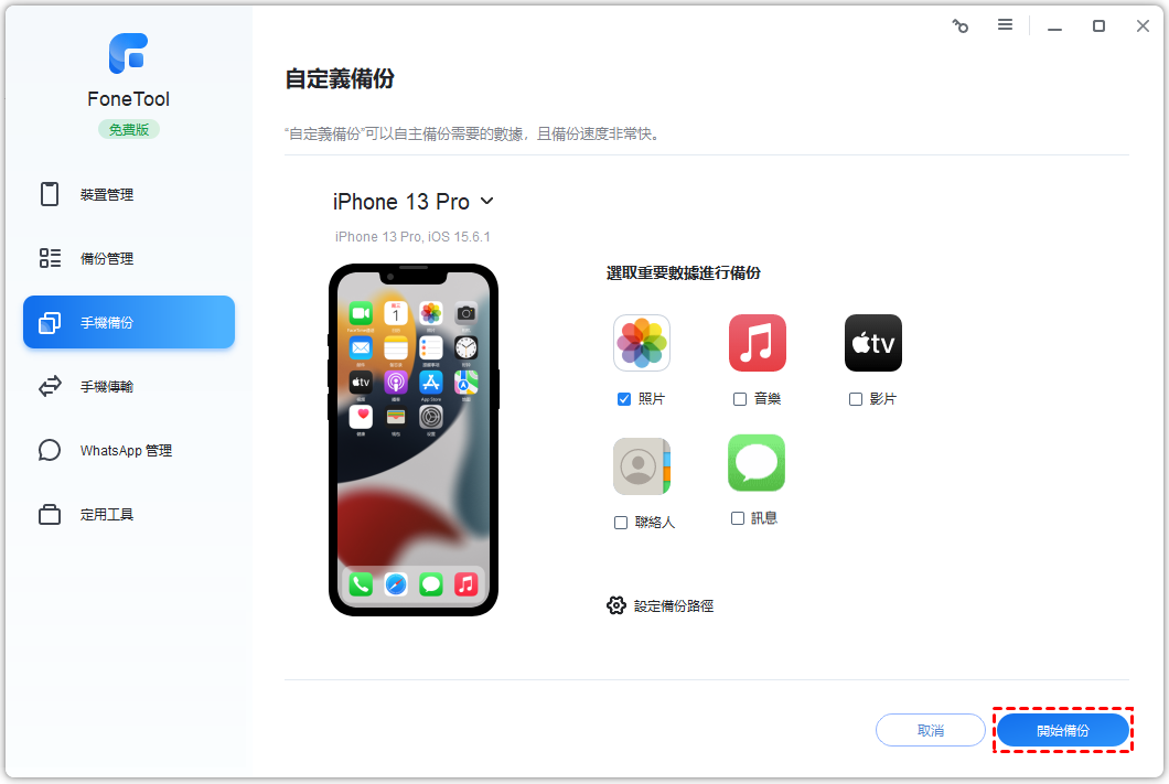如果您擔心會將重要的照片意外刪除,建議您嘗試FoneTool自選照片進行備份。FoneTool是一款專業的iOS數據備份和傳輸工具,它能很輕鬆地備份您想備份的數據,包括照片。