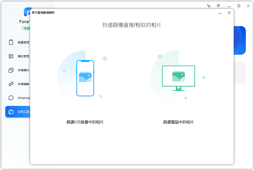 2. 運作FoneTool,點一下定用工具中的刪除重複照片。