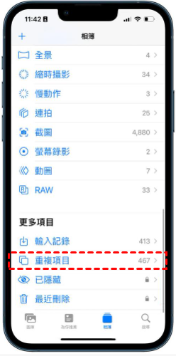 重複的照片可能會出現iPhone照片容量太大的問題。您可以在iPhone上查找和刪除重複照片來清除iPhone照片。如果您手機運作的系統是iOS 16或更高版本,那麼您可以之前前往相簿 > 重複選項 > 然後尋找需要刪除的重複照片將其刪除。
