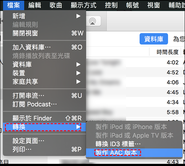 3. 完成曲目修剪後 > 選中曲目 > 點擊檔案 > 點擊轉換 > 建立AAC版本。之後,您將看到一首新歌曲出現在原始歌曲旁邊。