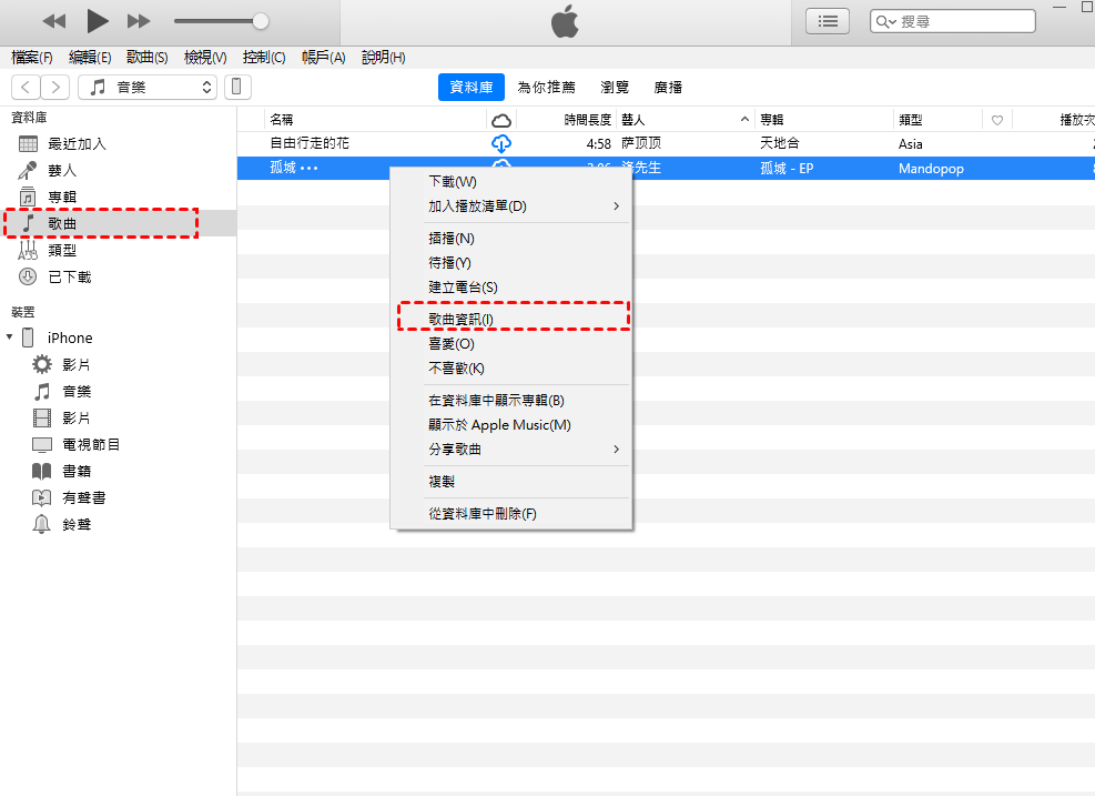 2. 轉到歌曲或最近添加以查找要轉換的MP3檔案 > 右鍵點擊歌曲並選取歌曲資訊。