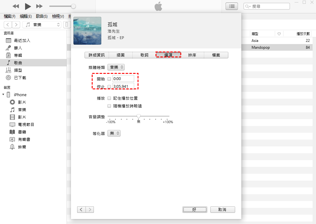 3. 在新資訊視窗中點擊選項 > 選中開始與停止旁邊的框 > 輸入曲目的開始與停止時間。最長時間為30秒 > 點擊確定。