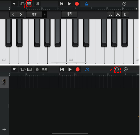 1. 啟用GarageBand > 點擊項目圖示 > 然後點擊迴旋圈。