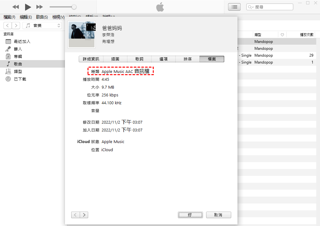 如果種類旁邊顯示為受保護,則表示該歌曲受 DRM 保護或不受支援。在這種情況下,您可以訂閱 iTunes Match 或 Apple Music 來欣賞音樂。
