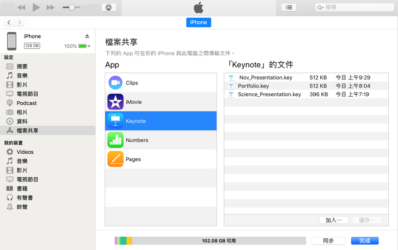 4. 選擇檔案共享 > 選取一個應用程式以查看哪些檔案可以在應用程式中共享 > 選取要傳輸到 PC 的內容 > 點擊同步。(如果您沒有在 iTunes 中看到檔案共享選項,則表示您的裝置沒有檔案共享程式)。