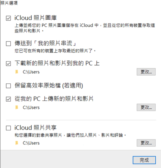 3. 選中 iCloud 照片圖庫與下載新的照片和影片到我的 PC 上。您也可以點擊下載選項旁邊的更改按鈕以改變下載定位。