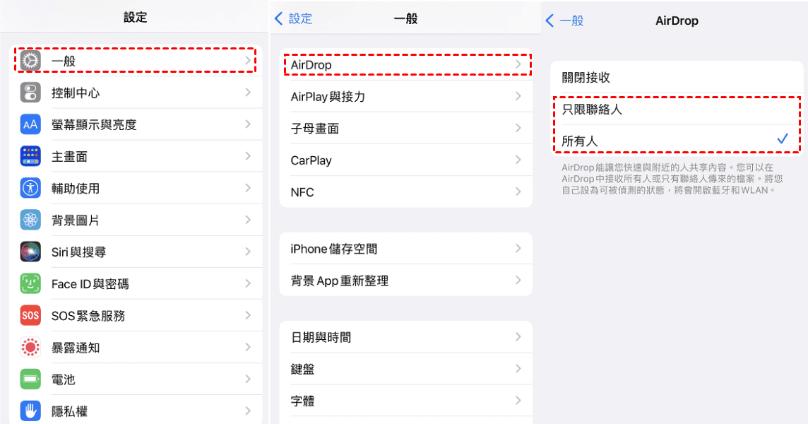 1. 在兩部iPhone上啟用AirDrop,然後選取只限聯絡人或所有人。