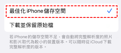 3. 選擇最佳化iPhone儲存空間或下載並保留原始檔。 前一個選項將在您的裝置上儲存節省空間的照片,同時在iCloud中保留原始的全分辨率版本。