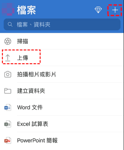 2.您可以在 OneDrive 中點擊畫面頂部的“+”圖示 > 然後,選取拍攝相片或影片或直接上傳。