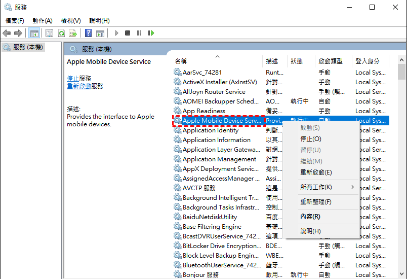 2. 在這裡找到並右鍵點擊 Apple Mobile Device Support ,選取修復選項, 按照螢幕提示進行修復。