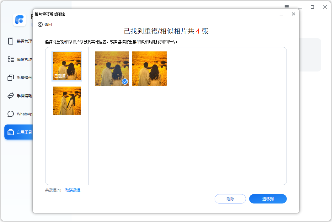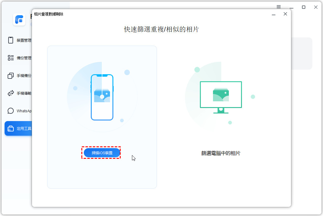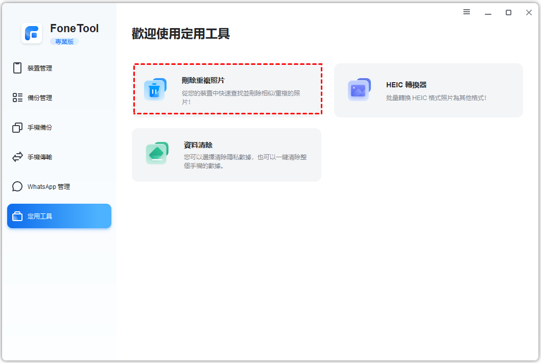 在FoneTool上點一下定用工具 > 選取照片重複。