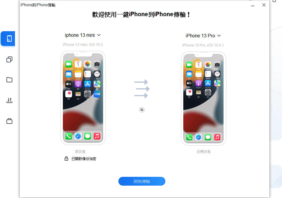點擊手機傳輸 ,選取iPhone到iPhone > 開始傳輸。