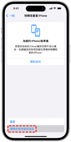 前往 iPhone 設定 > 一般 > 移轉或重置 iPhone > 重置 > 清除所有內容和設定,等待重置 iPhone 的過程完成即可。