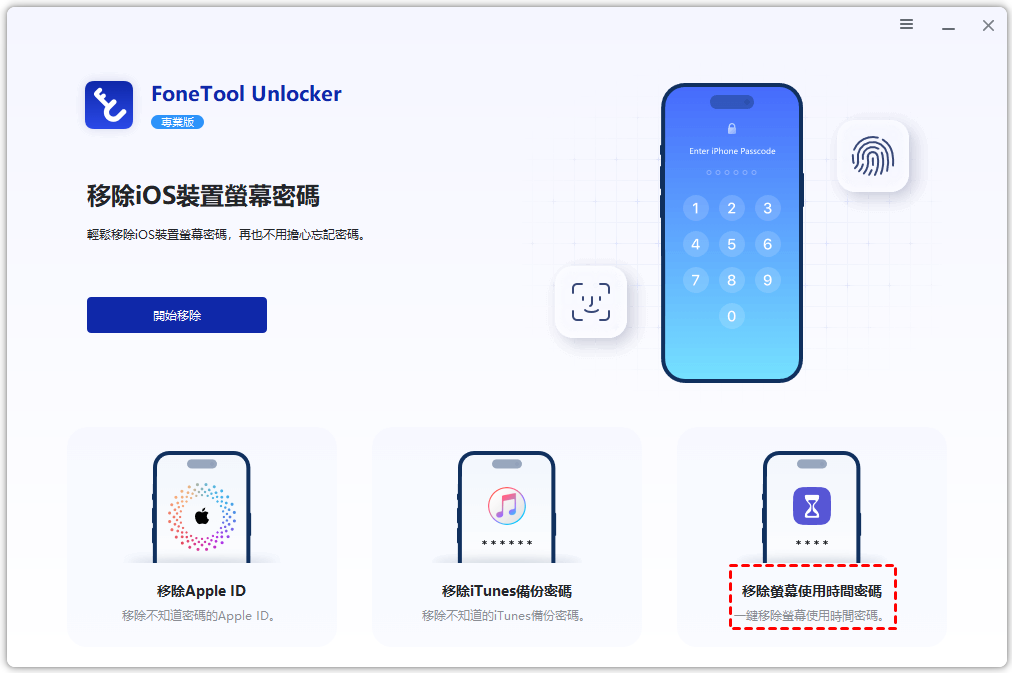✨小貼士:FoneTool Unlocker 不僅可以幫您移除螢幕使用時間密碼,還可以在您忘記密碼的情況下無需重置,幫您一鍵移除 Apple ID、螢幕密碼、iTunes 備份密碼等。您也可以在以下場景中使用它解決麻煩: