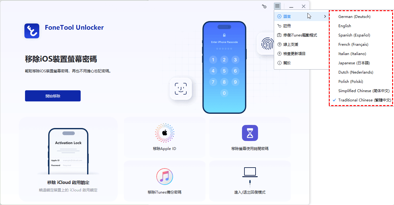 FoneTool Unlocker 支援多種語言,包括英語、德語、法語、日語、義大利語、西班牙語、荷蘭語、波蘭語、簡體中文和繁體中文。如果您想將其設定為您的母語,請參閱以下說明。