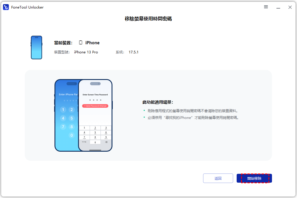 忘記了螢幕使用時間密碼或需要刪除應用程式使用限制?FoneTool Unlocker可協助您透過刪除螢幕使用時間密碼重新獲得對裝置的完全控制。請注意,此過程將清除所有螢幕時間設定,包括時間和應用程式限制。