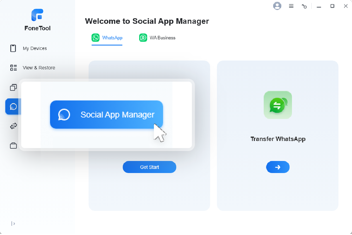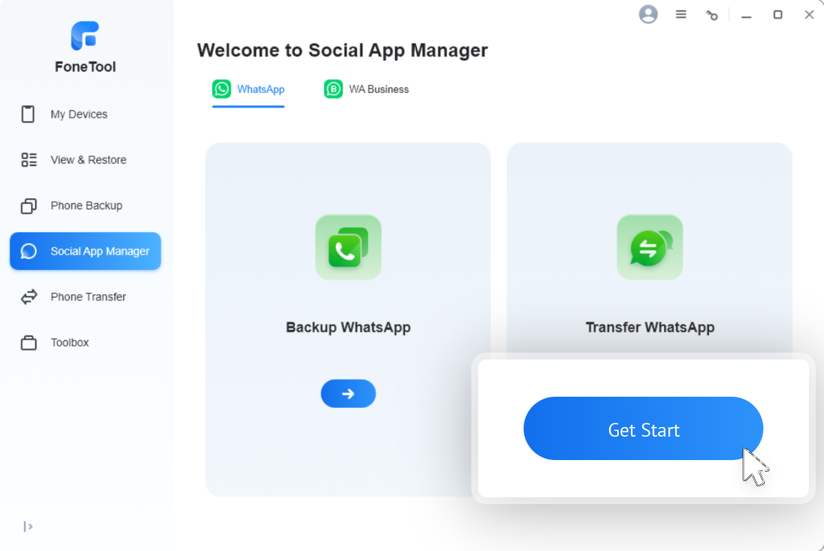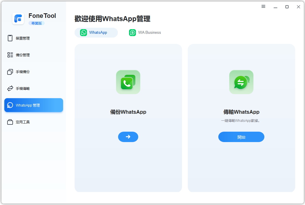 FoneTool 使用直觀的介面。 任何人都可以輕鬆備份和傳輸 WhatsApp 數據。