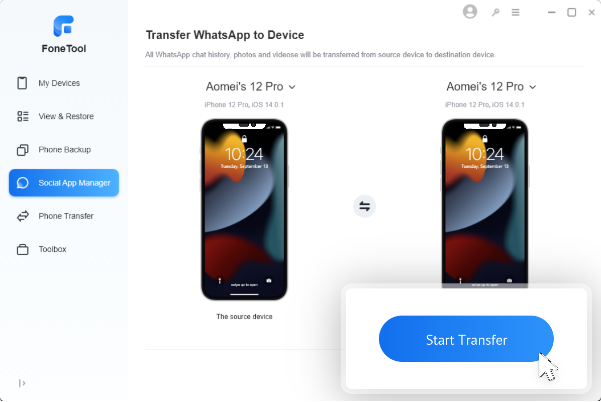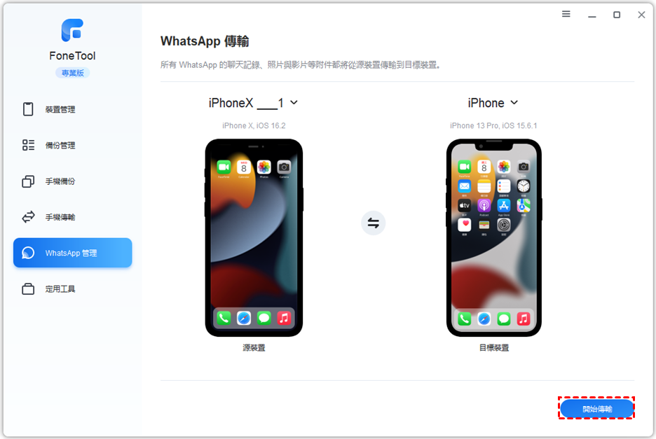 FoneTool 幫助您輕鬆快速地將 WhatsApp 對話記錄(個人和群組聊天)轉移到另一部 iPhone。