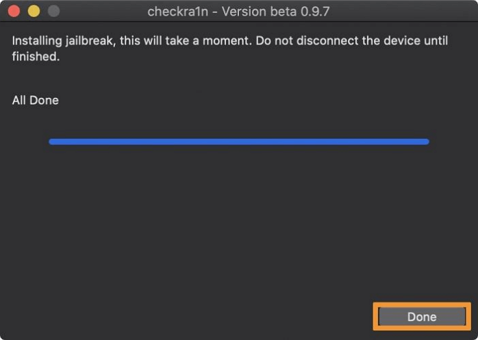 Step 4. Wait for the jailbreak to complete. Once finished, click "Done." On your jailbroken device, open the Checkra1n loader app and install Cydia to unlock new customization and functionality options.