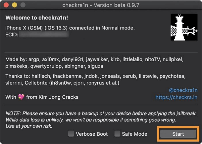 Step 2. Open the Checkra1n app from the "Applications" folder. The app will detect your device automatically. Click "Start," but ensure your device is in recovery mode before proceeding.