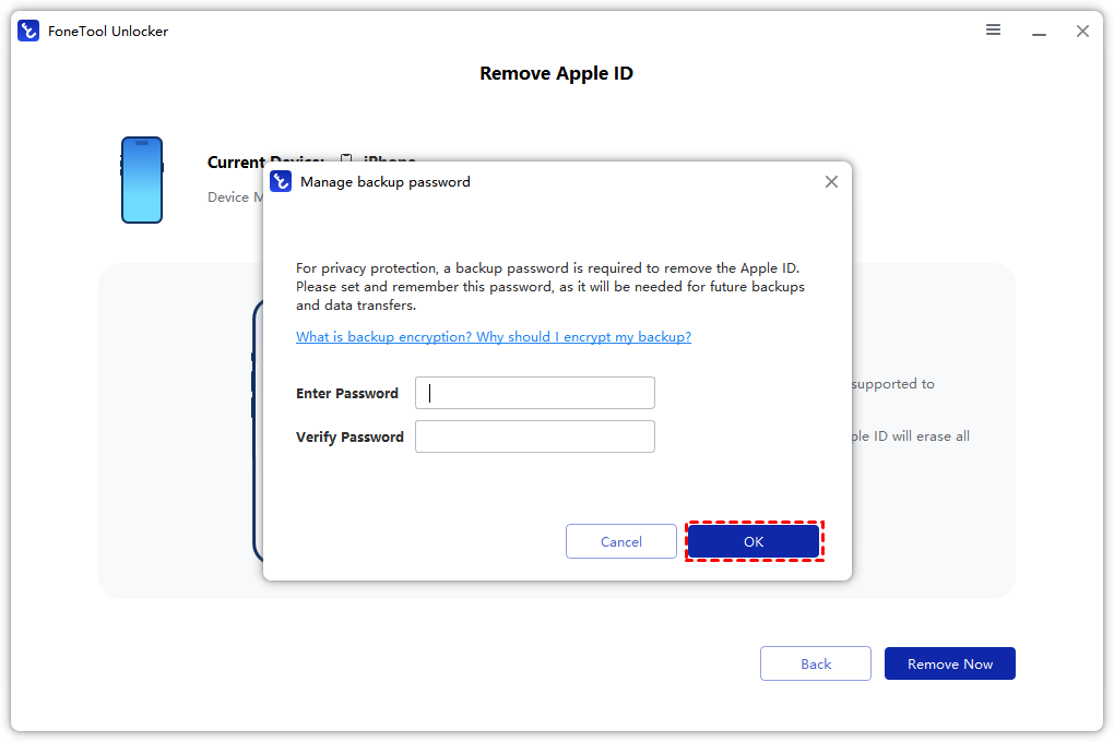 Step 3. Enter a backup password as instructed and enure you remember this password.