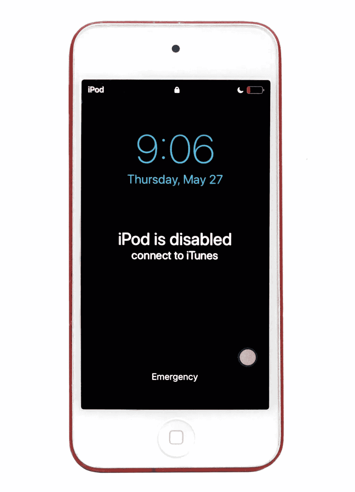 - "iPod is disabled. Connect to iTunes” (after 10 failed attempts)